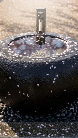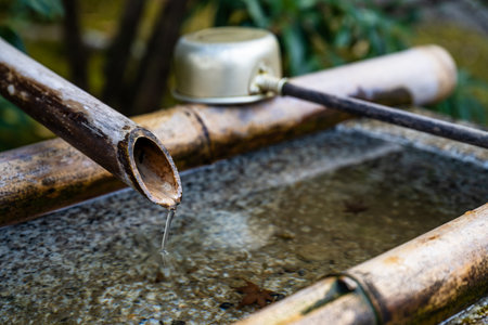 Soft focus view of a traditional Japanese water basin at a shrine, water gently flowing from a bamboo spout