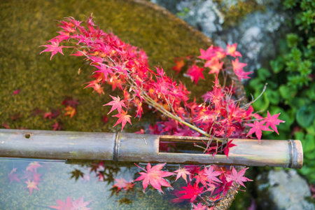 Red maple branch on bamboo over water basin decorat Enkoji temple garden in autumn, Kyoto, Japan. Japan. Famous travel destination for tourist sightseeing Kansai for fall season.
