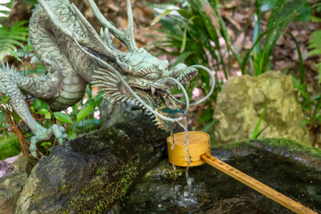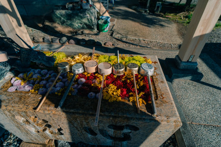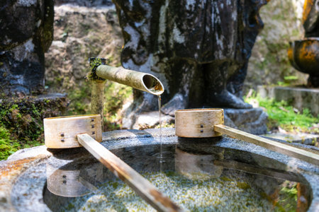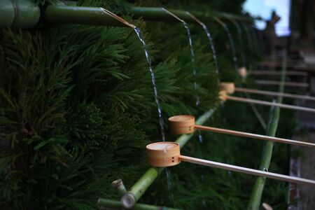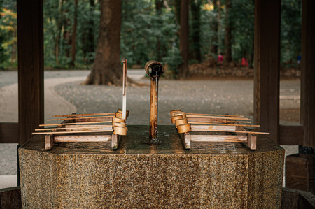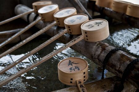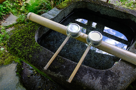 Awaji, Hyogo, Japan - 17th September 2018 : Picture of some ladle in a ChÅzubachi that are used to purify by the worshippers before entering a shrine. This are located at the Izanagi Shrine