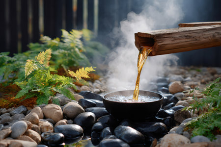 Steaming hot water being poured from wooden pipe into bowl in peaceful zen garden with ferns and rocks