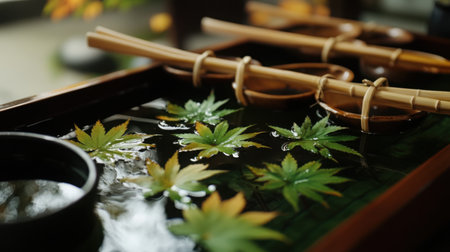 Elegant chanzy setup with fresh green maple leaves floating on the water surface beside bamboo ladles