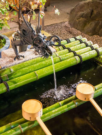 Japanese ladles at Shinto temple in Kyoto, Japan. In Japan, a tsukubai is a washbasin provided at the entrance to holy places for visitors to purify themselves.