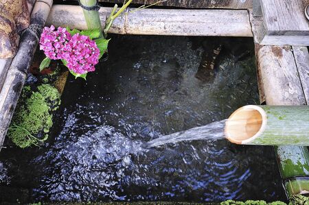 traditional Japanese water basin Tsukubai fragment with bamboo pipe water source