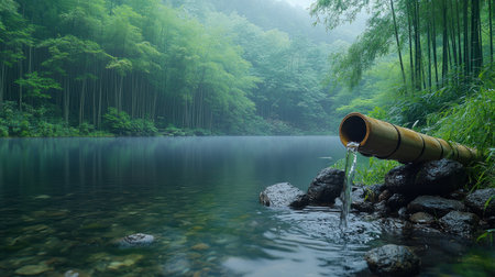 A serene scene capturing water gracefully flowing from a bamboo spout into a tranquil pond. Perfect for evoking calmness and connection with nature.