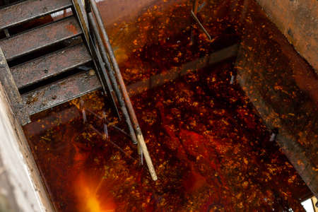A large circular industrial tank showcases a complex system for sludge removal, featuring a glass lid and metal mesh, filled with dark viscous liquid.