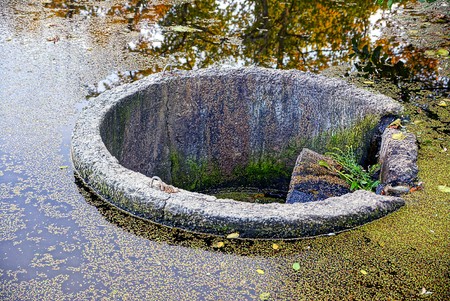 homemade well in the country. concrete rings lowered into the pit. Water is drawn from a well using a bucket. deep well, earthen water. use of natural resources.