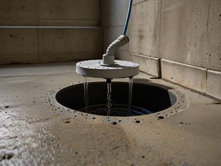 A sump pump sits in a gravel-filled pit in the corner of a damp, dark concrete basement. A single bare lightbulb from above illuminates the scene, highlighting the equipment designed for flood prevention and water removal in a home.