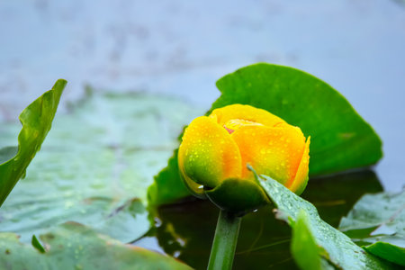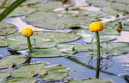 Yellow water lily growing and blossom on river. Pond overgrown with flowers nuphar lutea is perennial aquatic plant of family nymphaeaceae. Close up of spatterdock or pond-lily