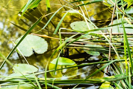 cane and lily pads float on the surface of a pond