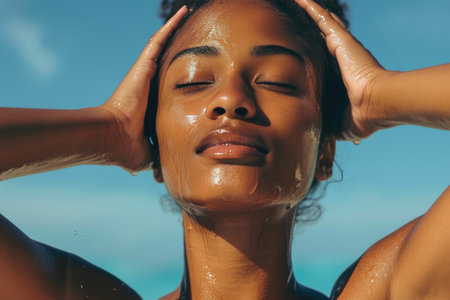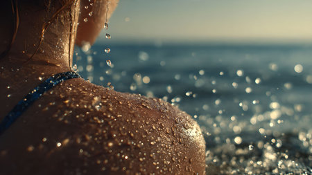 Close-up of water droplets glistening on a woman's skin against a blurred ocean backdrop, capturing a refreshing and invigorating moment.