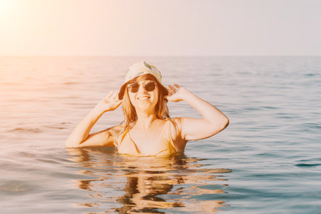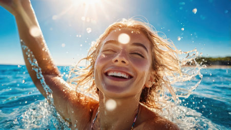 A woman swimming in the waves under the sun's rays, personifying freedom and harmony with nature; moment of happiness.