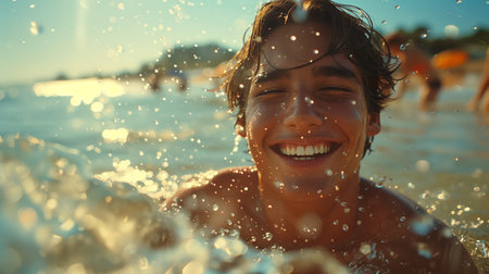 Joyful Young Man Enjoying a Sunny Day at the Beach While Splashing Water