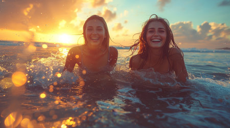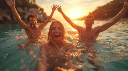 of a perfect vacation, showcases a dynamic group of friends, men and women, reveling in the sea at sunset. Laughter echoes over the waves as they enjoy a carefree swim,