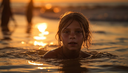 A young girl is happily swimming in the liquid landscape of the ocean at sunset, enjoying the fluid motions and reflections on the waters surface AIG50