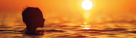 Banner of a young swimmer's silhouette against the setting sun, tranquil waters, space for your message.