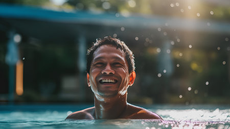 Portrait of happy man in swimming pool at luxury spa resort.