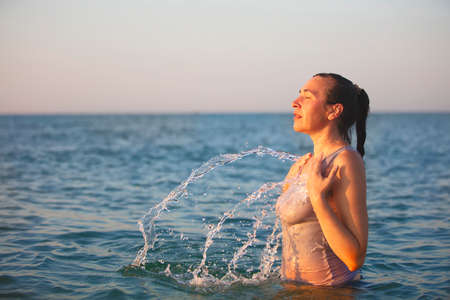 A middle-aged woman stands in the sea and splashes water.