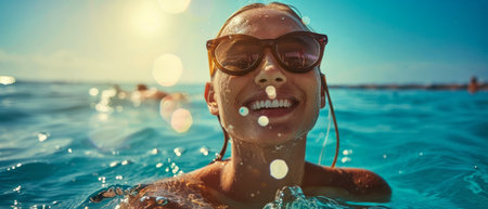A woman in a swimsuit is swimming in the ocean, wearing sunglasses. The sun reflects off the water as she enjoys her time in the refreshing sea.