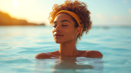 A woman stands serenely in the gentle waves, bathed in the golden light of a breathtaking sunset The vibrant sky reflects on the rippling water, creating a tranquil scene Laughter and splashes echo from the background as others enjoy the cool waters, adding to the sense of peaceful relaxation This image embodies the beauty and serenity of nature, perfect for calming and inspiring imagery AI Generative