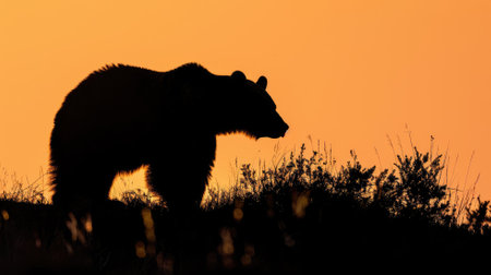 Bear silhouette on rocky hill at sunset, wildlife journey concept