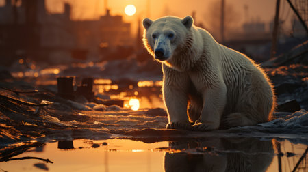 Lonesome Canadian Polar Bear walking into a glaring sunset over the Arctic tundra at the Hudson Bay, close to Churchill, Manitoba, in summer