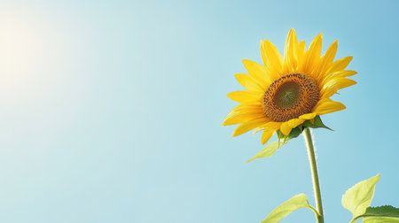 This vibrant sunflower stands tall against a soft blue background, showcasing its cheerful yellow petals and green leaves, perfect for nature-themed projects.