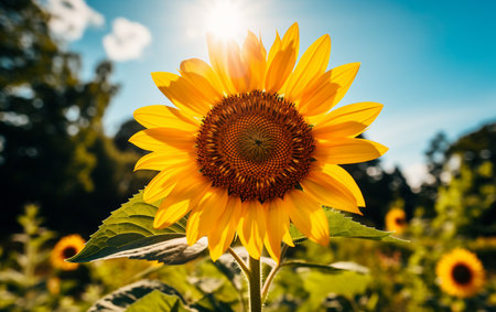 A vibrant sunflower stands tall against a clear blue sky, showcasing its bright yellow petals and intricate center. An ideal image for nature themes.