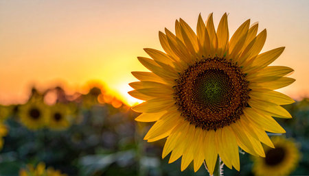 Vibrant sunflower with bright yellow petals and a dark center, facing the warm light of a setting sun in a green field. represents nature, summer, and growth.