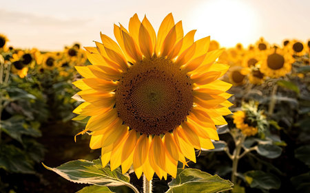 A stunning sunflower field captured during golden hour, showcasing vibrant yellow blooms against a serene sky. Ideal for nature lovers and agricultural themes.