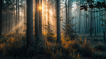Golden sunlight breaks through the tall trees in a tranquil forest. The mist enhances the peaceful atmosphere, inviting calm and reflection at the start of the day.
