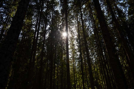 Looking up at the sun shining through the tree canopy in a dark forest. Eibsee, Garmisch-Partenkirchen, Germany.