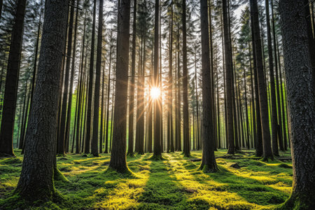 Sunlight streams through dense tree canopies, creating a serene atmosphere in the woods. Rays illuminate the forest floor, showcasing natures tranquility and beauty.