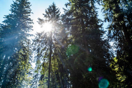 Through the coniferous forest, the sun shines on a summer's day.spruce