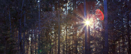 the sun shines through the trees at sunset, glare from the sun in the forest, evening photo taken in a dark key