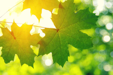 Vibrant green maple leaves catch the soft sunlight, creating a serene atmosphere in nature. The blurred background enhances the tranquility of this outdoor scene.