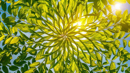 Bright green leaves illuminated by sunlight in a serene outdoor environment during a clear day
