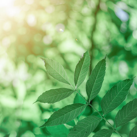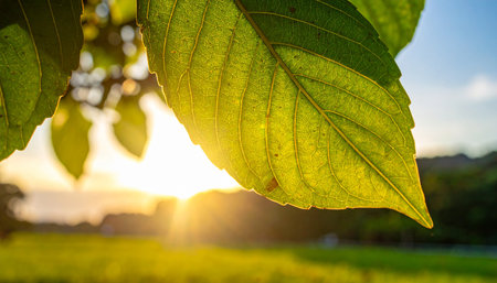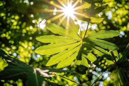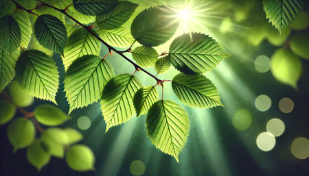 A captivating image showcasing fresh green leaves illuminated by sunlight, creating a vibrant and serene atmosphere. Ideal for nature-inspired themes.