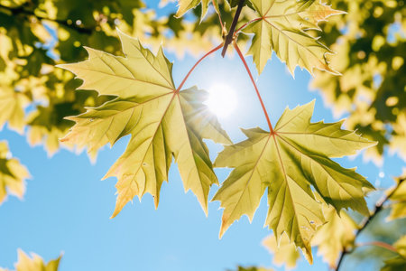 Fresh green leaves illuminated by morning sunlight against a clear blue sky, nature concept