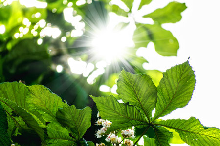 Chestnut tree with back light and lush foliage at springtime, aesculus hippocastanum