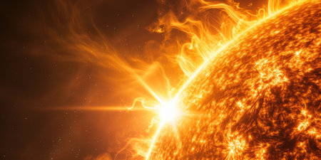 Close-up of the sun with vibrant solar flares and intense magnetic storms. Highlighting the sun's dynamic energy and its impact on space weather