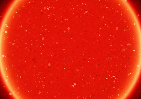 A vibrant red sun with a bright orange glow and white specks in the atmosphere