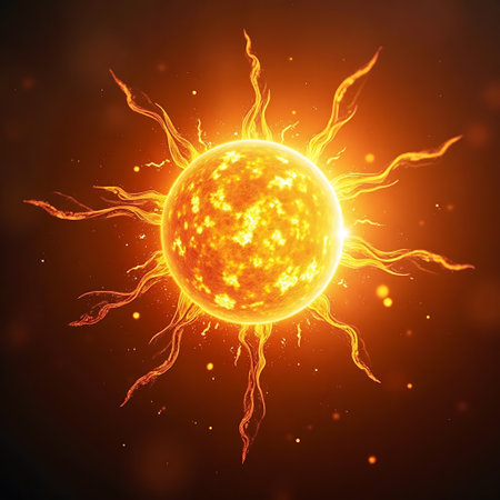 A glowing sun radiates warmth with bright golden light and flowing rays against a dark backdrop creating a celestial and energetic atmosphere, ideal for science, education, or artistic projects.