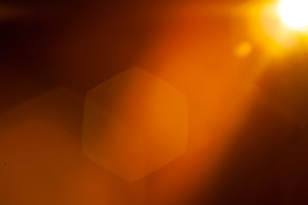 Abstract orange sparkling light rays and lighting flare bokeh against on dark black background