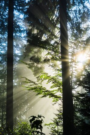Foggy morning in the coniferous forest with sun rays