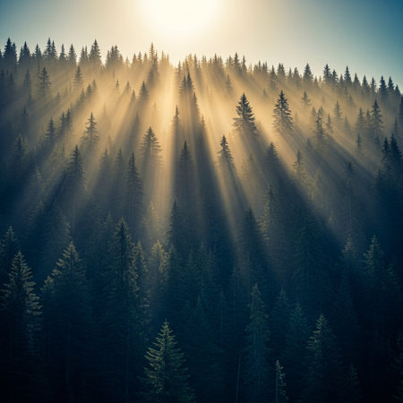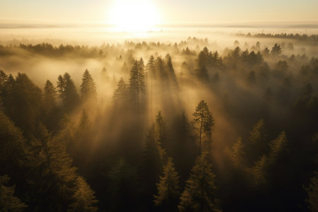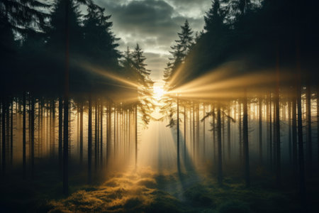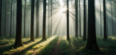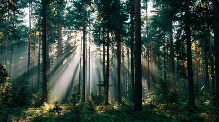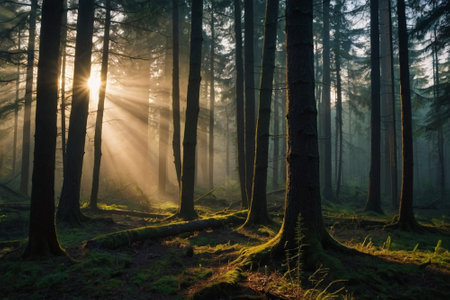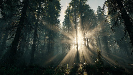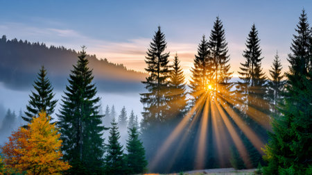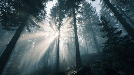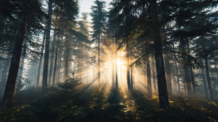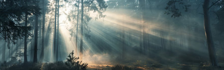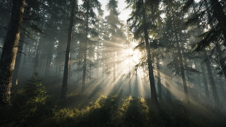 Sunbeams illuminate a foggy pine forest landscape during a peaceful morning sunrise