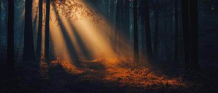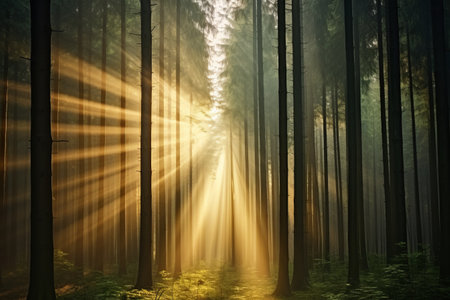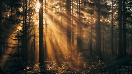 Golden sunbeams piercing through the misty forest at sunrise, creating an enchanting and serene atmosphere filled with beauty