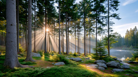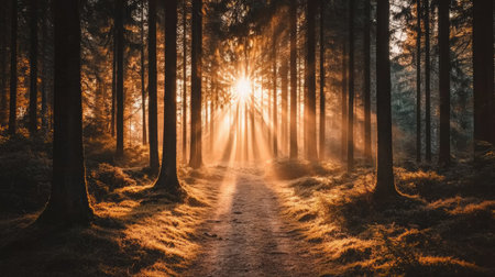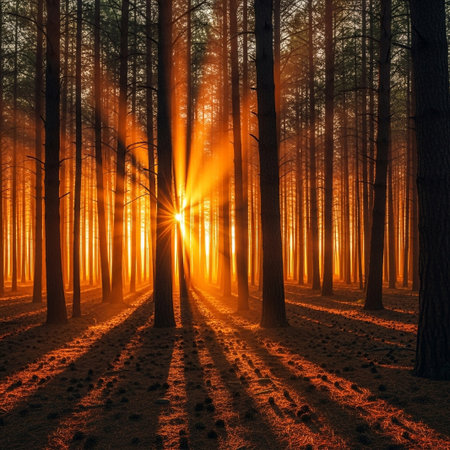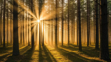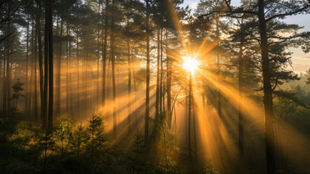 A vibrant sunrise filters through dense forest, casting radiant beams of light between tall trees. warm glow creates serene and magical atmosphere, highlighting natural beauty of woodland