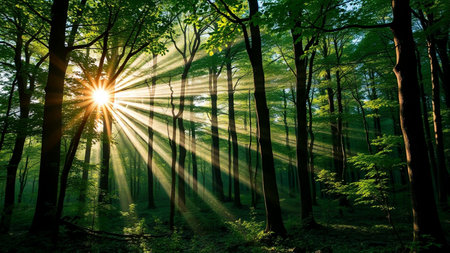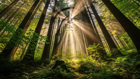 Sunlight beams illuminate the towering trees in a dense forest. The image captures the natural beauty with a low angle view. The composition features tall trees, green foliage, and bright rays of light, conveying a sense of serenity and the wonders of nature.
