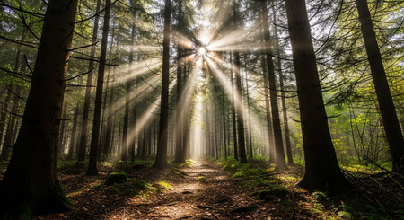 Ethereal sunlight filters through towering trees in a dense forest, creating radiant rays and a tranquil atmosphere, showcasing the beauty of nature and serenity.