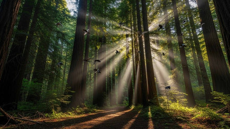 A peaceful forest scene showcasing a pathway illuminated by soft rays of sunlight filtering through tall trees, creating a serene and tranquil atmosphere for nature lovers.